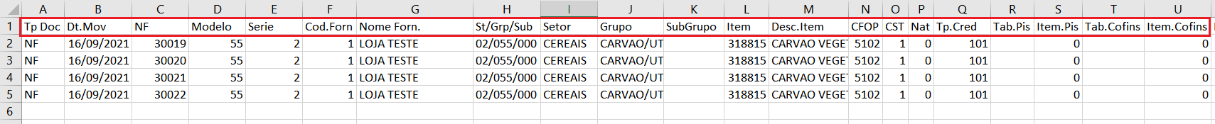 Exemplo do Relatório PIS COFINS em Formato CSV (parte 2)