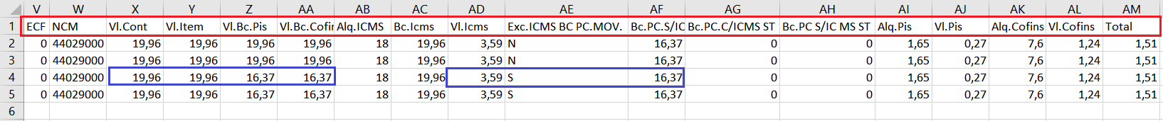 Observe no exemplo acima que a linha 4, referente a nota 30021 gerada no tópico 2 - Emitindo Nota Fiscal de Venda com Dedução de ICMS na Base de Cálculo Pis Cofins, possui corretamente a dedução de ICMS na BC Pis Cofins (campo Vl.Bc.Pis, coluna Z; campo Vl.BC.Cofins, coluna AA; Bc.PC.S/ICMS, coluna AF), além da identificação de dedução definida com a letra S (campo Exc.ICMS BC PC. Mov, coluna AE).