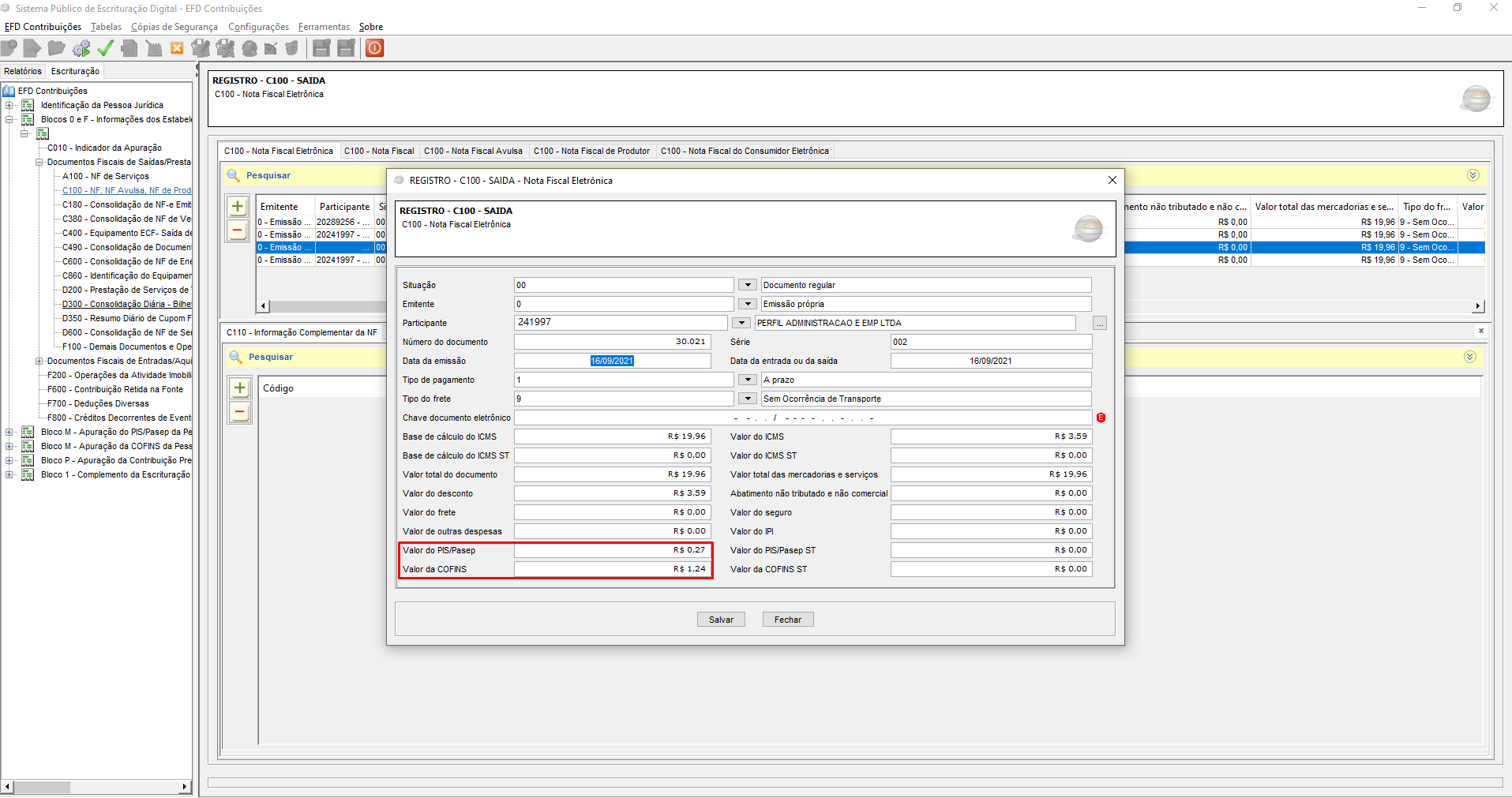 Abaixo segue a gravação do Pis e Cofins no registro C100 já considerando a dedução de ICMS da BC.