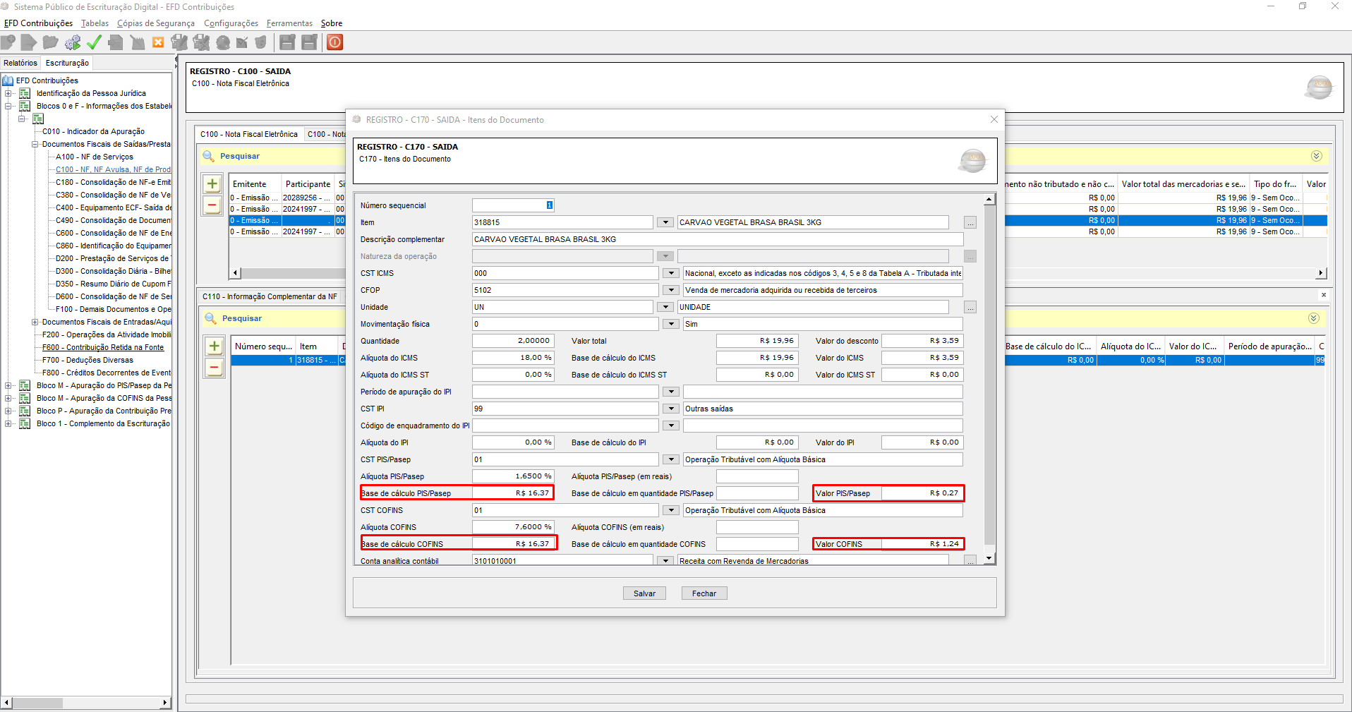 Abaixo segue a gravação da BC Pis e Cofins no registro C170 com a dedução de ICMS.
