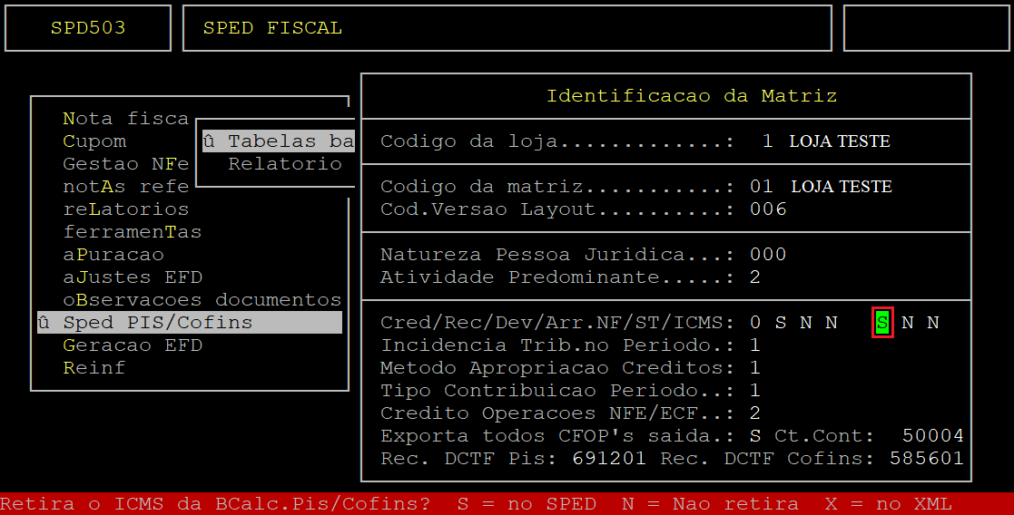 Ao ser exibida a pergunta " Retira o ICMS da Base de Calculo de Pis/Cofins? ", informe a letra S para excluir o ICMS no Sped, ou N para não excluir, ou X para excluir do XML.