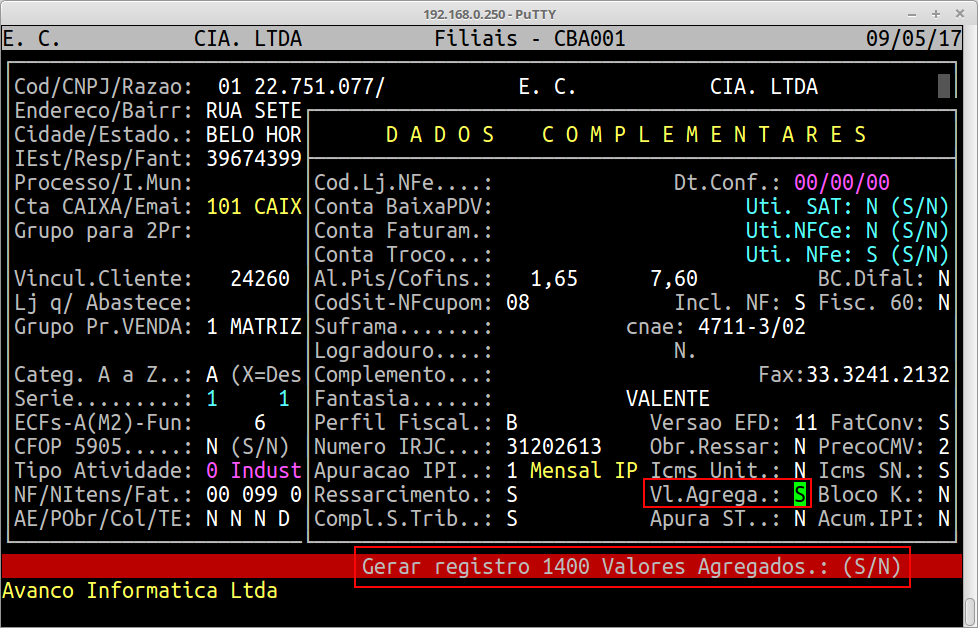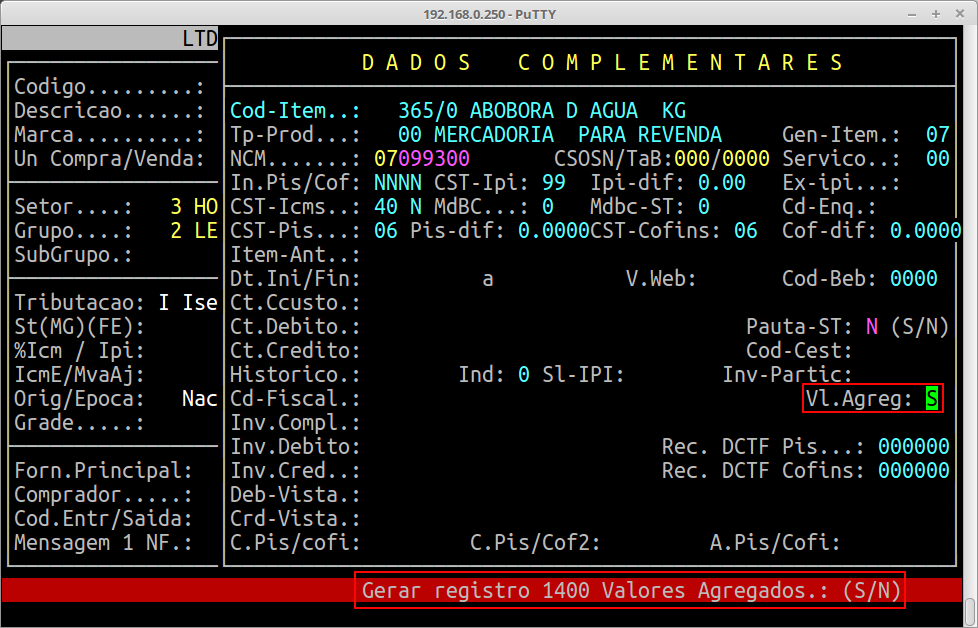 Pressione a tecla ENTER até a tela de Dados Complementares, no campo Vl. Agrega, pressione a tecla S para que o sistema possa gerar o Registro 1400 de valores agregados.