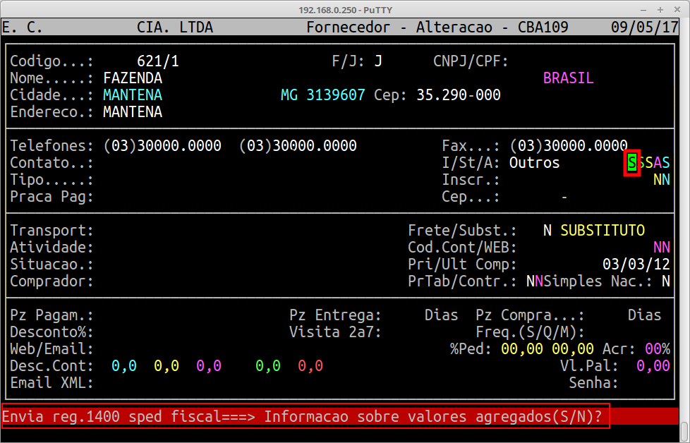 No campo I/St/A, na primeira posição, informe S para que o sistema envie o Registro 1400 para o SPED Fiscal.