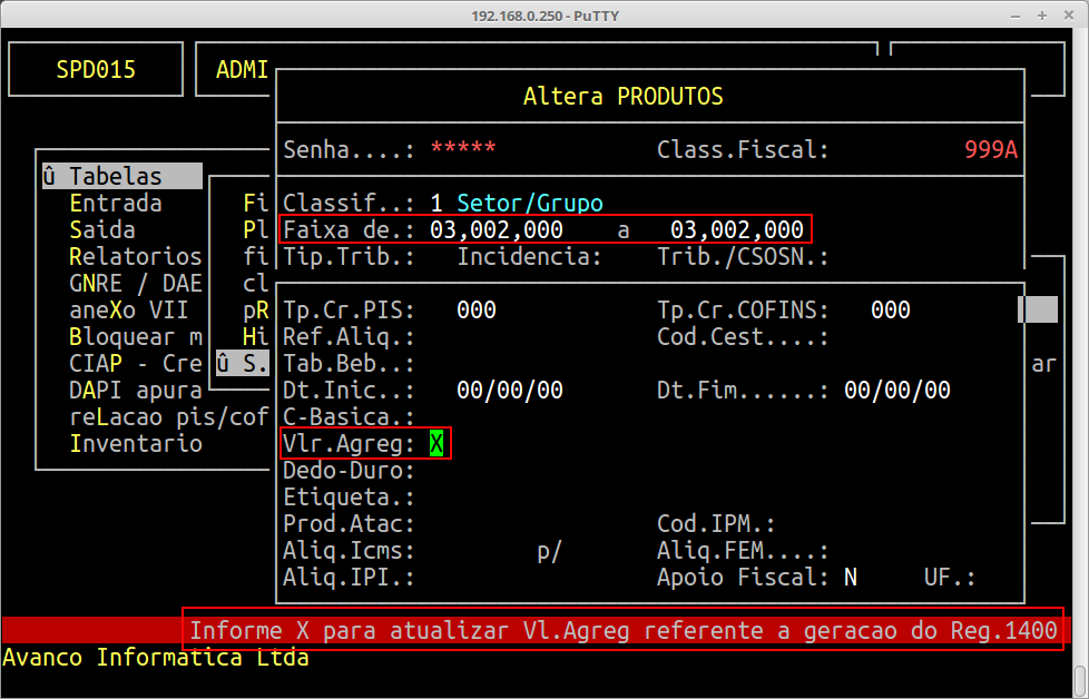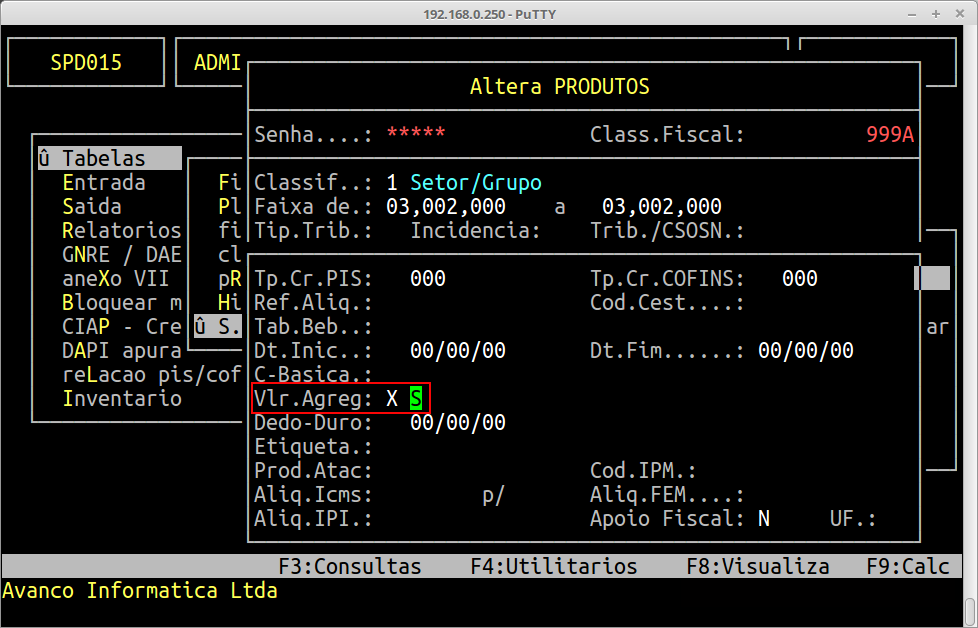 Pressione a tecla ENTER até a segunda tela da Rotina, no campo Vl. Agreg, pressione a tecla X e pressione ENTER, depois pressione a tecla S, ou seja, estamos informando ao sistema que vamos alterar o parâmetro Vl. Agreg para o valor S.