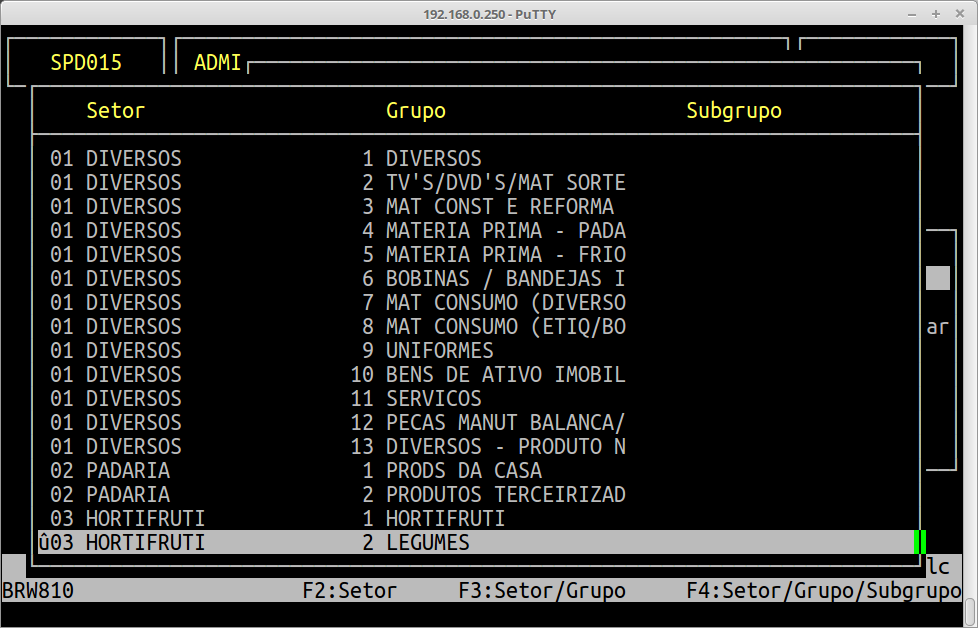 Pressione a tecla F2 para selecionar um setor e grupo. Selecionamos o Setor: 3 - Hortifruti e Grupo: 2 - Legumes