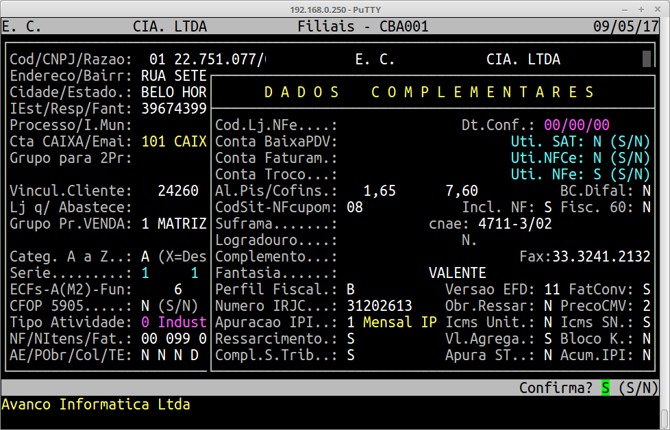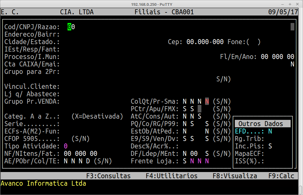 No campo Cod/CNPJ/Razao, informe o código da filial. Pressione a tecla A para alterar o cadastro.