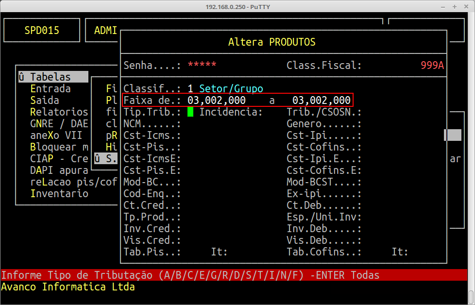 Caso escolha alterar os produtos pelo campo Classif, informe a faixa de produtos que serão alterados no campo Faixa de.