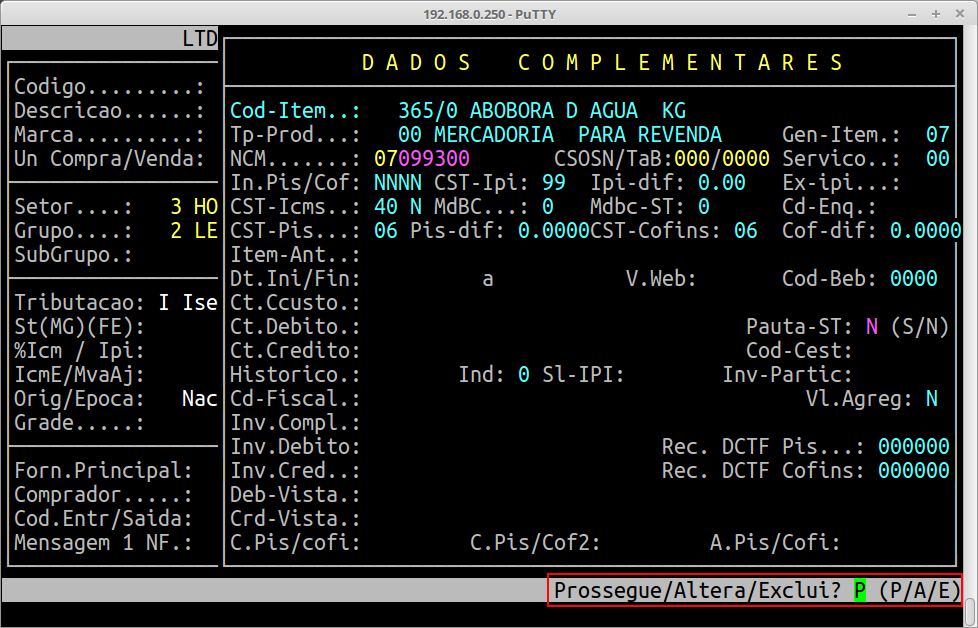 Pesquise o produto desejado e pressione a tecla ENTER até a tela de Dados Complementares.