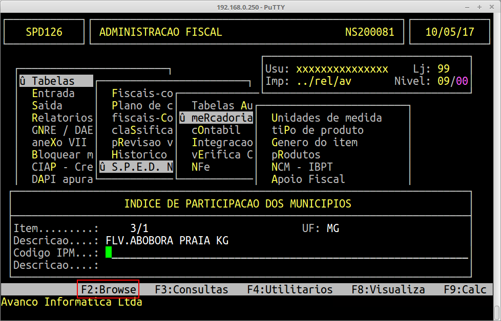 No campo seguinte, pressione a tecla F2 para selecionar o código correspondente.