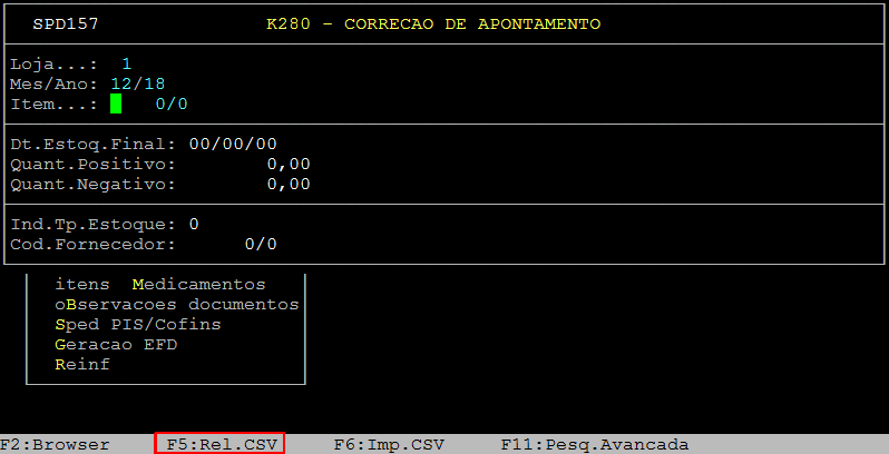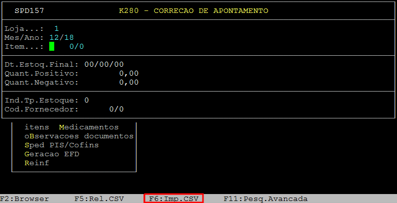 Ao acessar a rotina, informe o número da loja (campo Loja) e a referência (Mes/Ano) desejadas. Ao alcançar o campo Item, pressione a tecla F6 (Imp.CSV) para importar o relatório em csv.