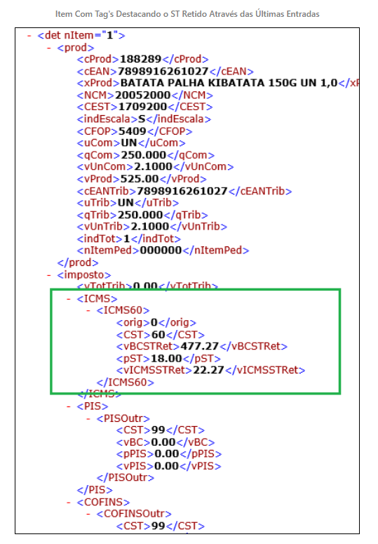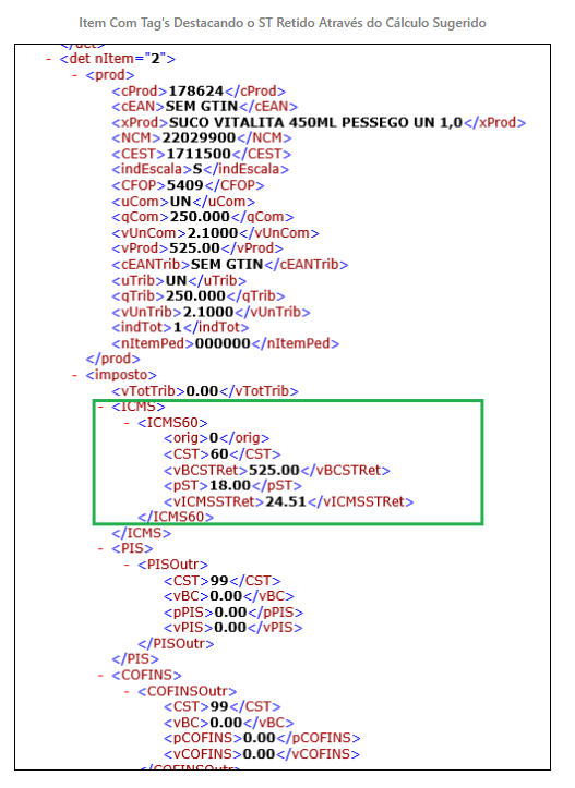 Observe nos exemplos abaixo, que no XML foi destacado as tag's de ICMS ST Retido para os itens 18828/9 e o 17862/4, no qual um tinha o valor retido na última entrada da nota e o outro teve a sugestão de cálculo do sistema, respectivamente.
