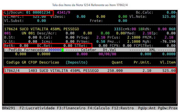 Após preencher os campos da capa, pressione a tecla Enter para alcançar a tela do item. Em seguida, digite as informações do item que teve entrada com ST Retido.