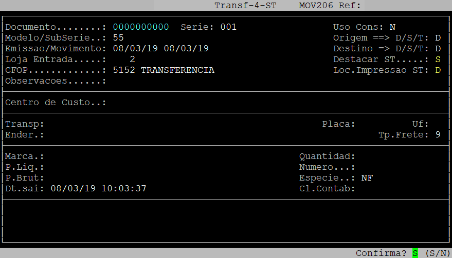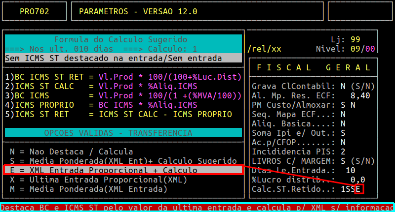 Ao acessar a rotina, pressione a tecla Enter até alcançar o campo Calc.ST.Retido (no quarto parâmetro), no qual deverá informar a letra E, correspondente a opção de destacar a BASE e ICMS ST Retido na transferência considerando a última entrada do XML mais o cálculo sugerido, ou pressione a tecla F2 para consultar as opções e selecionar a desejada, conforme os exemplos abaixo.