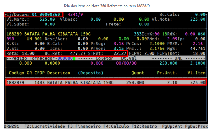 Observe no exemplo acima que a nota 360 possui 250 do item 18828/9, sendo assim, não será necessário considerar outra nota para compor o cálculo da retenção do ST.