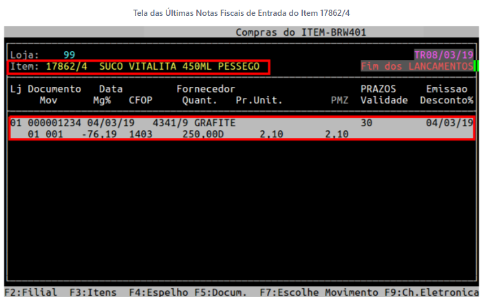 No exemplo abaixo, será mostrado as últimas entradas dos item 17862/4.