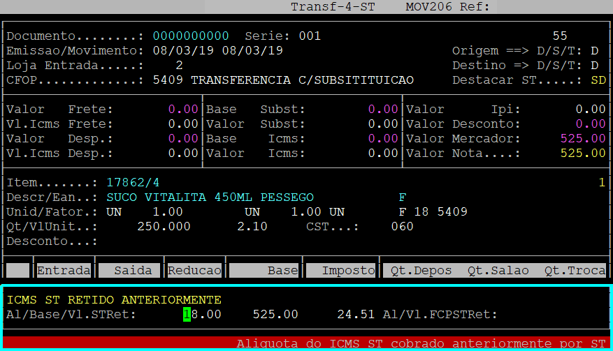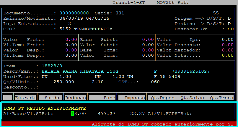 2.3 - Emitindo a NF-e de Saída Transferência Destacando Base e ICMS ST Retido Considerando a Última Entrada