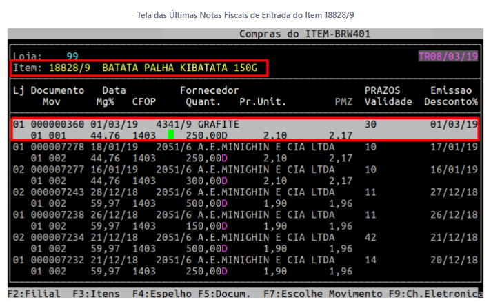 No exemplo abaixo, será mostrado as últimas entradas do item 18828/9.