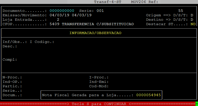 Caso não tenha selecionado a loja correta para emissão da nota de transferência, pressione a tecla F2 e informe a loja desejada.