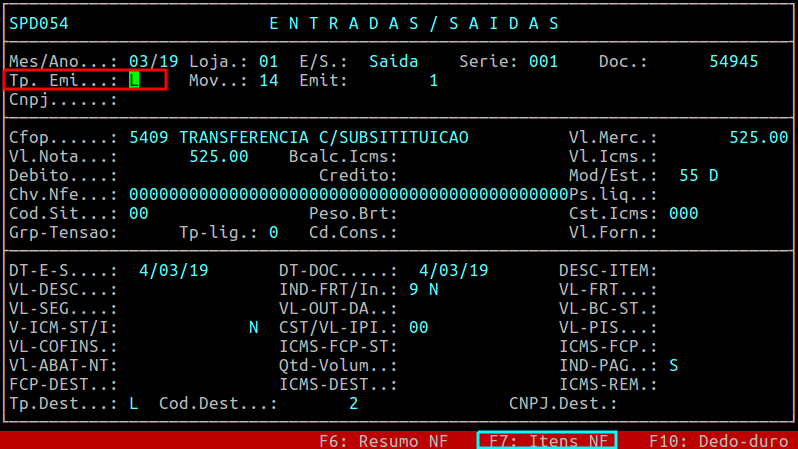 Ao acessar a rotina, pressione a tecla F7 (itens NF) no campo Tp.Emi para consultar o itens da nota fiscal.