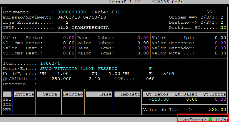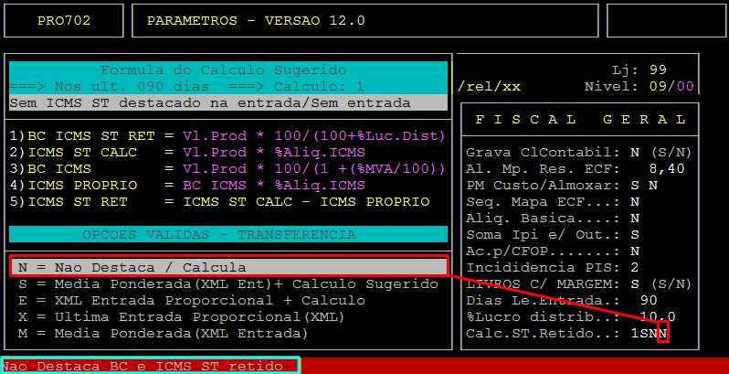 Ao acessar a rotina, pressione a tecla Enter até alcançar o campo Calc.ST.Retido (no quarto parâmetro), no qual deverá informar a letra N, correspondente a opção de NÃO destacar a BASE e ICMS ST Retido na transferência, ou pressione a tecla F2 para consultar as opções e selecionar a desejada, conforme os exemplos abaixo.