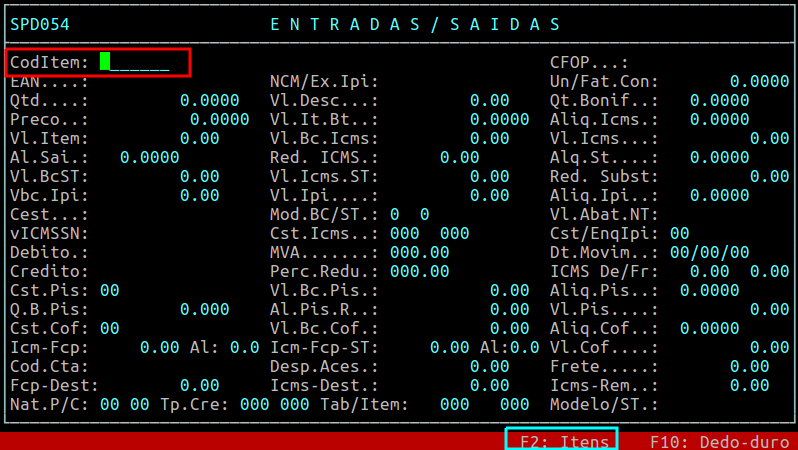 Após preencher os campos da capa, pressione a tecla Enter para alcançar a tela do item. Em seguida digite as informações do item.