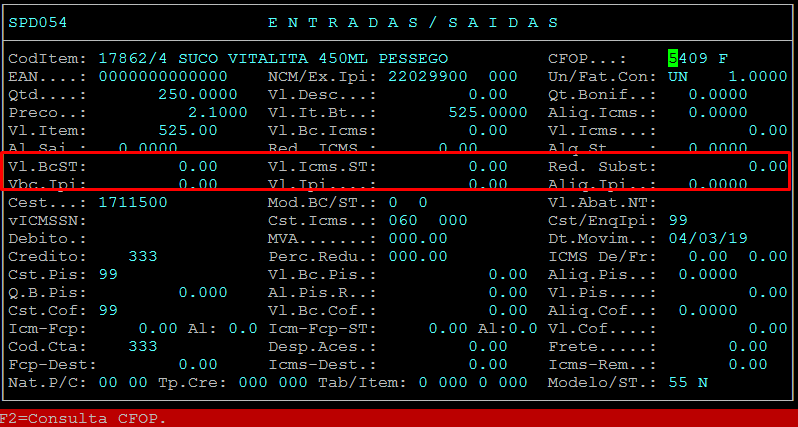 O sistema exibirá a consulta do item que NÃO houve destaque dos valores ICMS ST Retido, conforme exemplo abaixo.