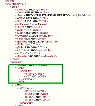 Observe no exemplo abaixo, que no XML NÃO foi destacado as tag's de ICMS ST Retido.