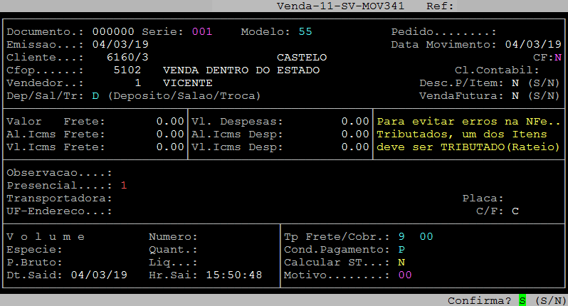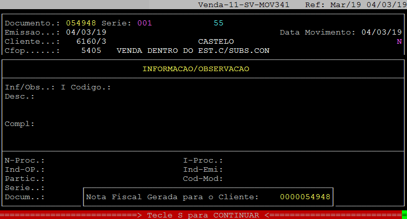 Em sequência deverá encerrar a emissão da NF-e preenchendo os campos necessários e pressionando a tecla Enter até aparecer o número da nota fiscal. Para sair da rotina, pressione a tecla Esc, conforme o exemplo abaixo.