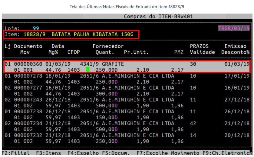 No exemplo abaixo, será mostrado as últimas entradas do item 18828/9.