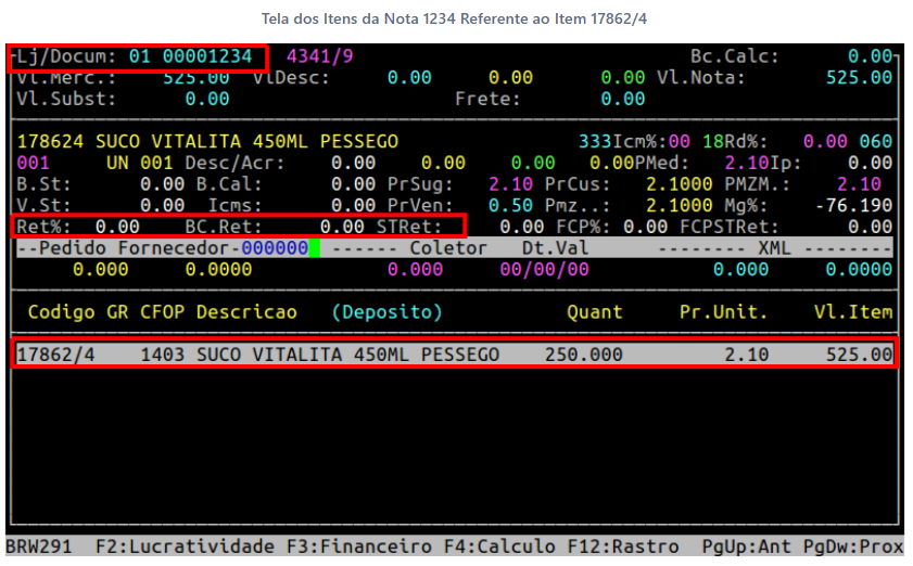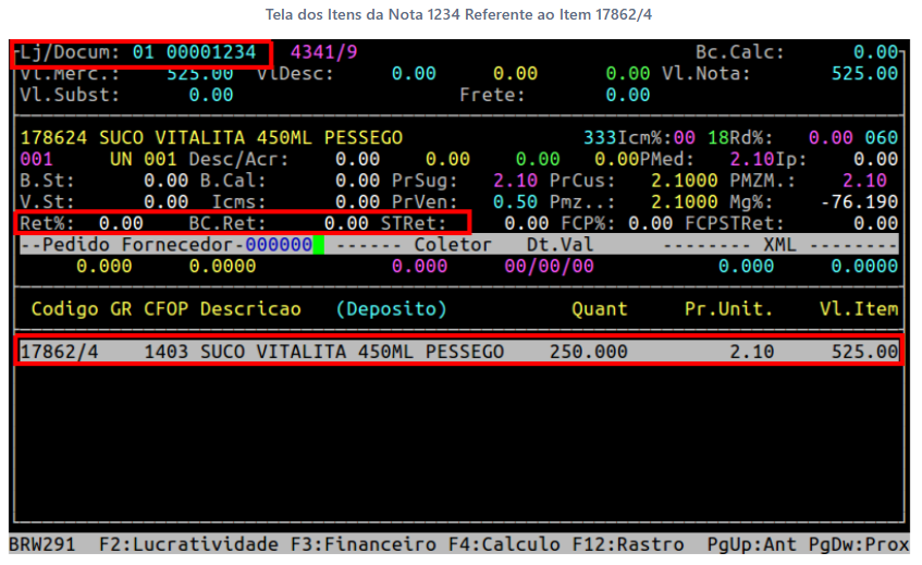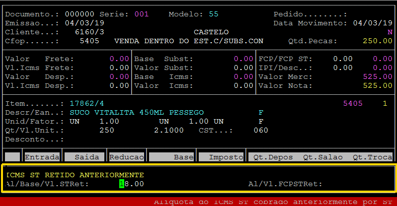 Após preencher os campos da capa, pressione a tecla Enter para alcançar a tela do item. Em seguida, digite as informações do item que teve entrada com ST Retido.