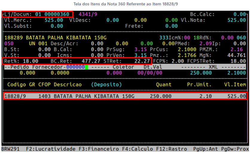 Observe no exemplo acima que a nota 360 possui 250 do item 18828/9, sendo assim, não será necessário considerar outra nota para compor o cálculo da retenção do ST.