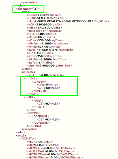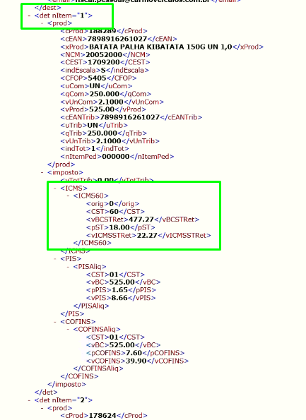Observe nos exemplos abaixo, que no XML foi destacado as tag's de ICMS ST Retido apenas para o item 18828/9, no qual tinha o valor retido na última entrada da nota..