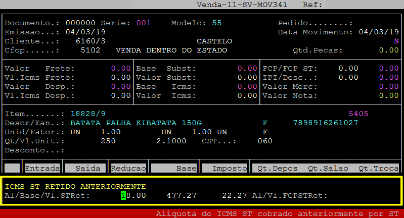 Observe no exemplo abaixo, que o valor de ICMS ST Retido preenchido pelo sistema foi o mesmo da última entrada deste item (NF-e 360), conforme mostrado no subtópico 2.1 - Detalhamento da Última Entrada de XML de Exemplo para Emissão da Nota Fiscal.