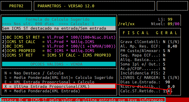 Ao acessar a rotina, pressione a tecla Enter até alcançar o campo Calc.ST.Retido (no terceiro parâmetro), no qual deverá informar a letra X, correspondente a opção de destacar a BASE e ICMS ST Retido na venda considerando a última entrada do XML, ou pressione a tecla F2 para consultar as opções e selecionar a desejada, conforme os exemplos abaixo.