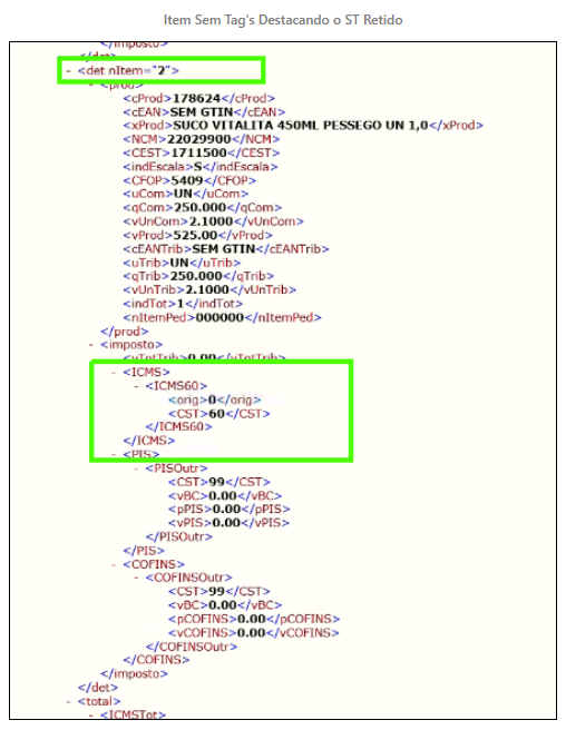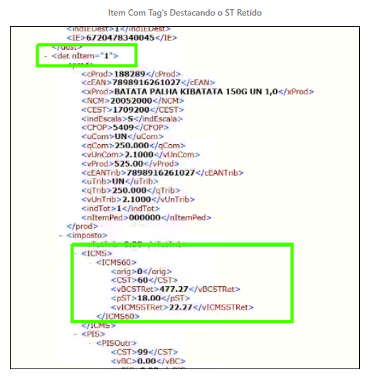 Observe nos exemplos abaixo, que no XML foi destacado as tag's de ICMS ST Retido apenas para o item 18828/9, no qual tinha o valor retido na última entrada da nota.