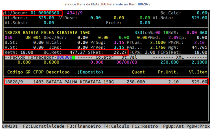 Observe no exemplo acima que a nota 360 possui 250 do item 18828/9, sendo assim, não será necessário considerar outra nota para compor o cálculo da retenção do ST.