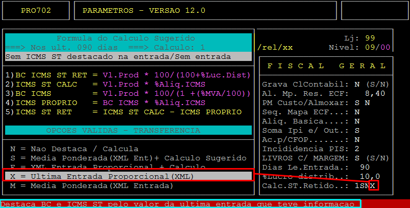 Ao acessar a rotina, pressione a tecla Enter até alcançar o campo Calc.ST.Retido (no quarto parâmetro), no qual deverá informar a letra X, correspondente a opção de destacar a BASE e ICMS ST Retido na transferência considerando a última entrada do XML, ou pressione a tecla F2 para consultar as opções e selecionar a desejada, conforme os exemplos abaixo.