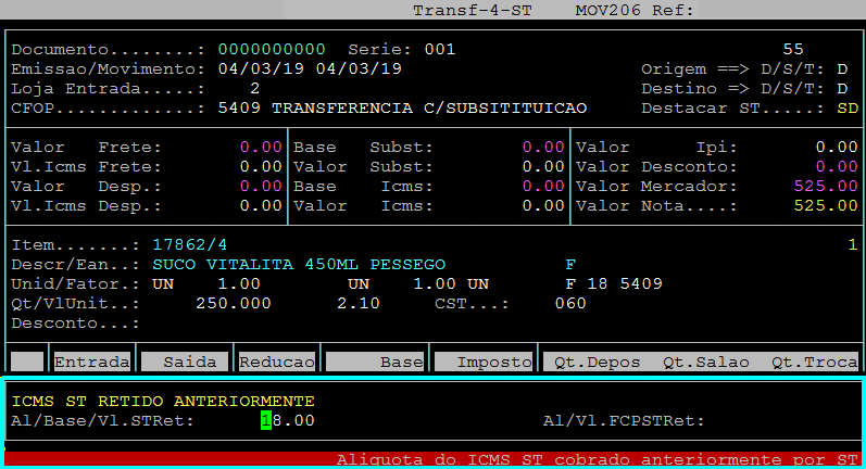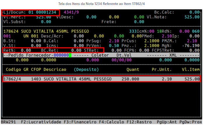 Após preencher os campos da capa, pressione a tecla Enter para alcançar a tela do item. Em seguida, digite as informações do item que teve entrada com ST Retido.