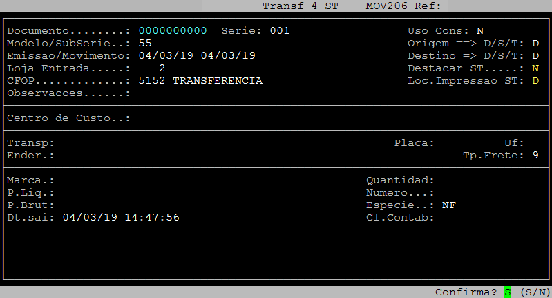 | Rotina: | Transferência - Inclusão |