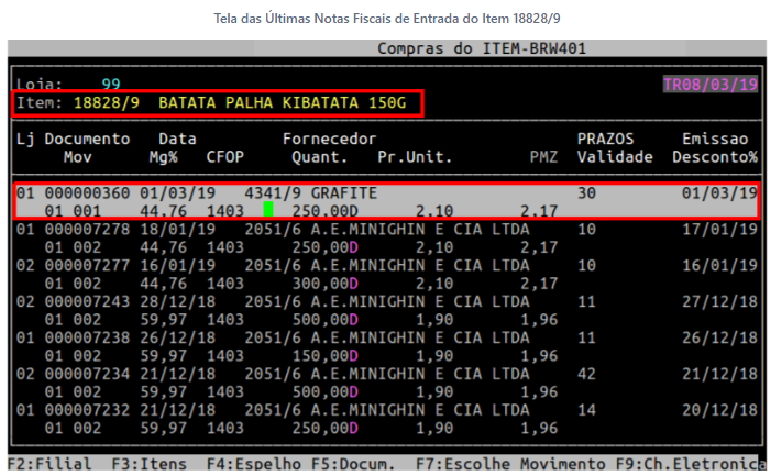 No exemplo abaixo, será mostrado as últimas entradas do item 18828/9.