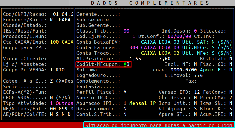 Ao acessar a tela dos Dados Complementares, pressione a tecla Enter até alcançar o campo CodSit-NFcupom, informe a situação 08 ou situação 00, conforme orientação da contabilidade, e em sequência, pressione a tecla Enter até confirmar.