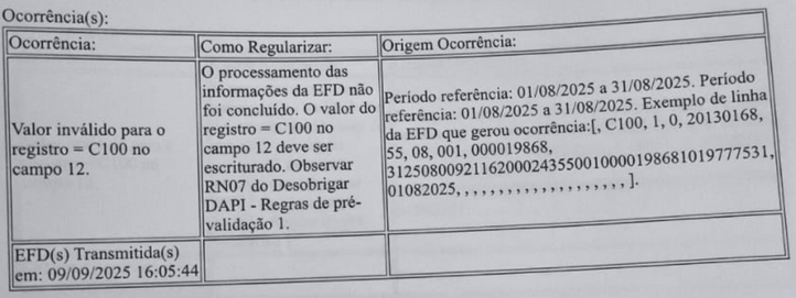 Entretanto, ao chegar na SEF/MG, o arquivo passa por regras adicionais de pré-validação (Desobrigar DAPI – Regras 1 e 2). Nessas regras, o campo 12 do C100 continua sendo obrigatório para determinados tipos de documentos, e quando está vazio ou incompatível, gera a ocorrência: