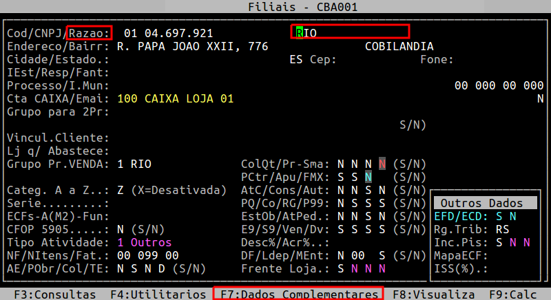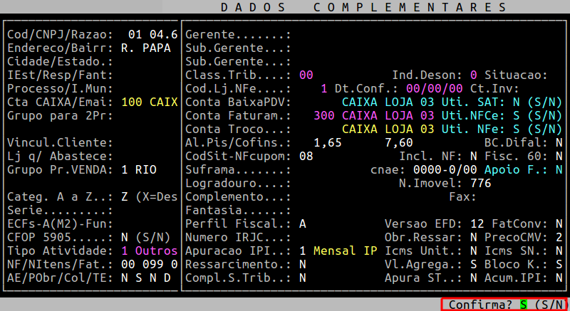 Pressione a tecla Enter para alcançar o campo Razao. Em seguida, pressione a tecla F7 para acessar a tela de Dados Complementares e confirma com a tecla Enter ou S.