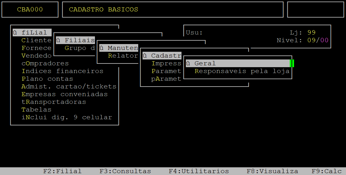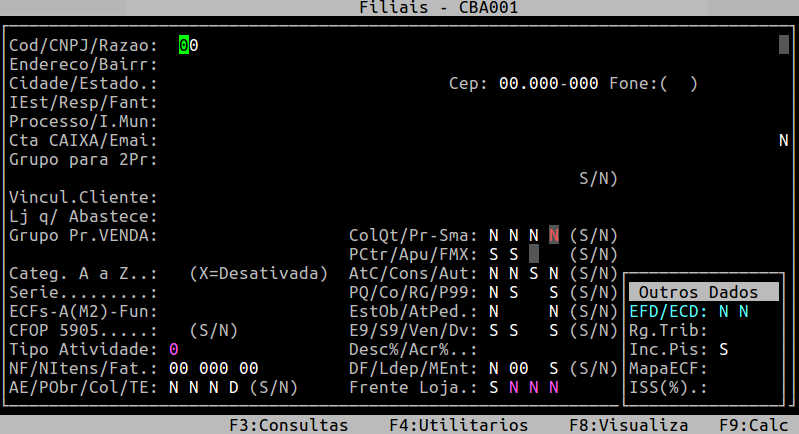| Localização: | Cadastros basicos / Filial / Filiais / Manutencao / Cadastro / Geral |