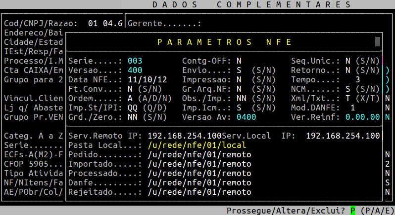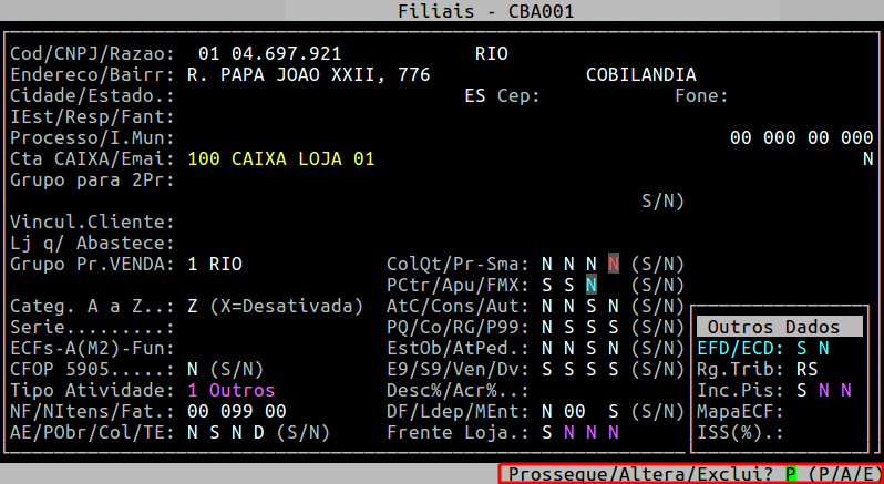 Ao acessar a rotina, informe no campo Cod o código da empresa e pressione a tecla Enter para carregar as informações. Quando o sistema exibir a mensagem Prossegue/Altera/Exclui, informe a letra A para alterar.