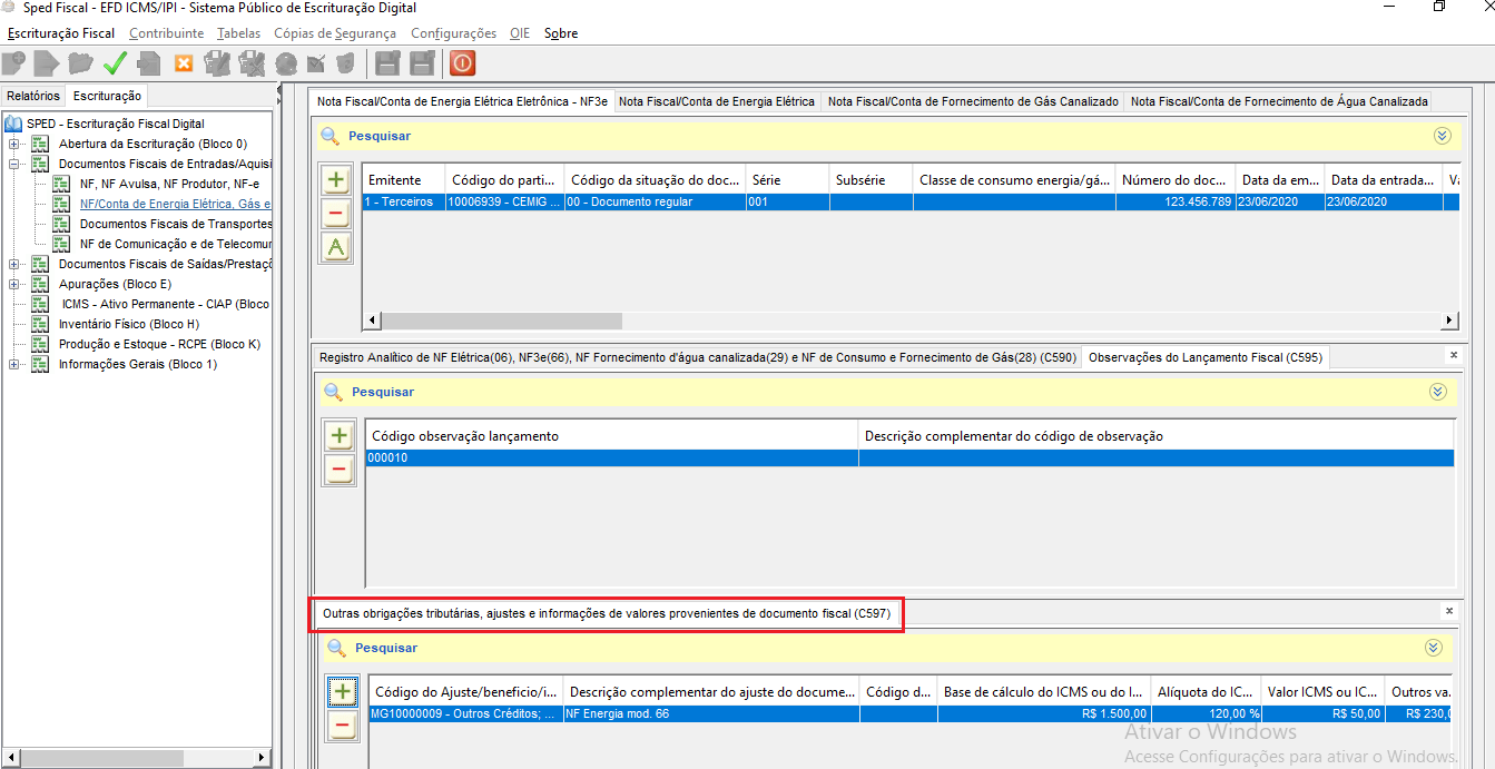 Abaixo segue um exemplo da tela do registro C500 e seus filhos no validador do sped.
