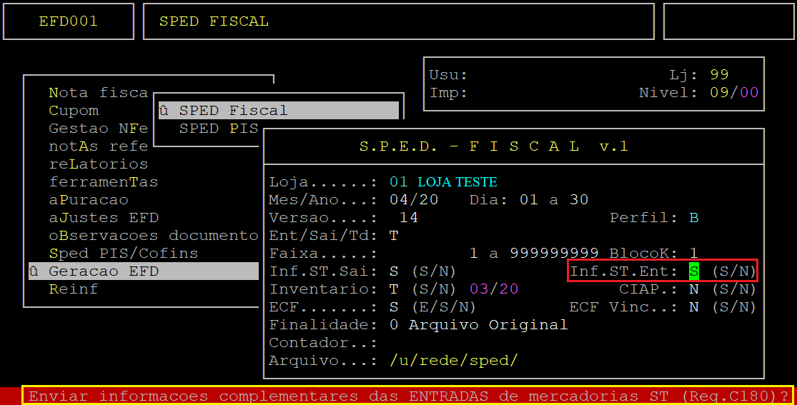 Ao acessar a rotina, preencha os campos desejados (conforme o documento citado anteriormente) e ao alcançar o campo Inventario informe a letra T para que o arquivo seja gerado com a informação de ICMS ST nas mercadorias de inventário.