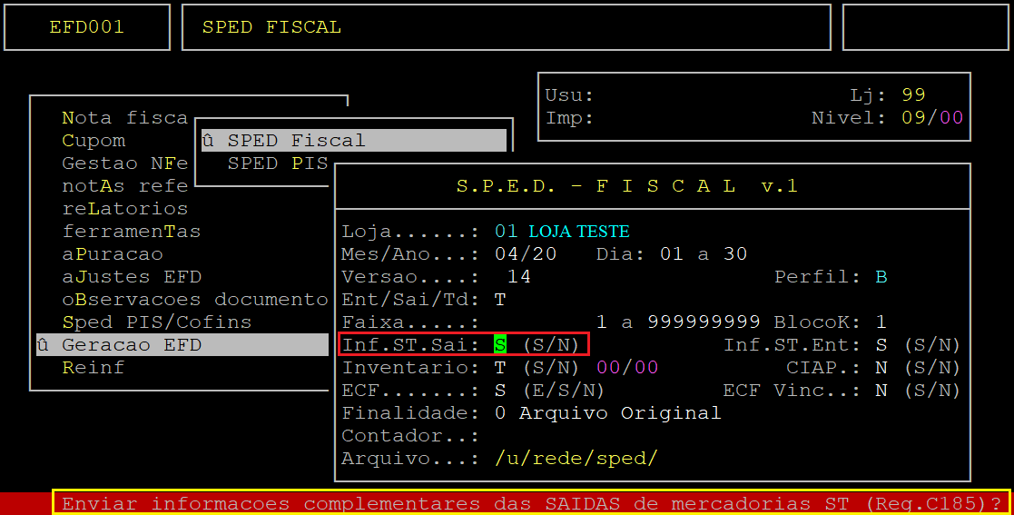 Ao acessar a rotina, preencha os campos desejados (conforme o documento citado anteriormente) e ao alcançar o campo Inf.ST.Sai informe a letra S para que o arquivo seja gerado com a informação de ICMS ST nas notas de saída.