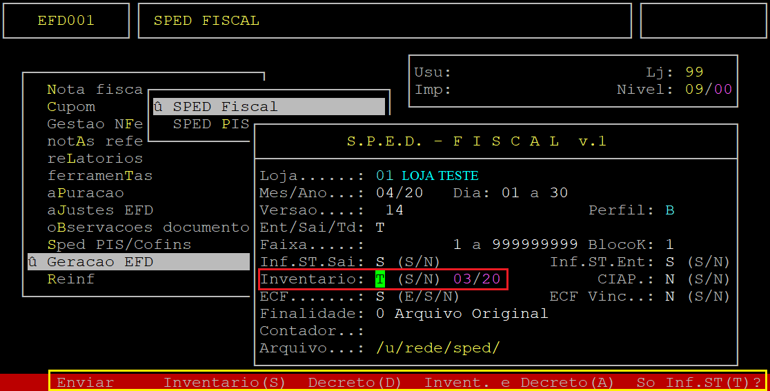 OBSERVAÇÕES: O sistema somente exibirá a opção T no campo Inventario se for informado a letra S nos campos Inf.ST.Sai e Inf.ST.Ent. Para utilizar a opção de inventário para gerar o Sped Fiscal é necessário bloquear o inventário previamente. Para mais informações, consulte os documentos: " Dúvida | Como Bloquear Inventário Fiscal no Integral? " ou " Dúvida | Como Bloquear Inventário Fiscal no Integral Varejo? ". |