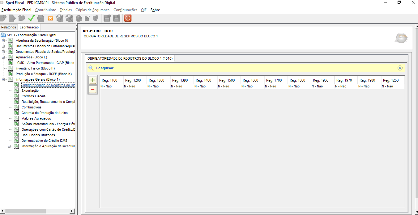 O bloco 1 virá com N-Não quando não tiver informações, porém, quando existir notas com as informações dos respectivos registros virá como S-Sim.